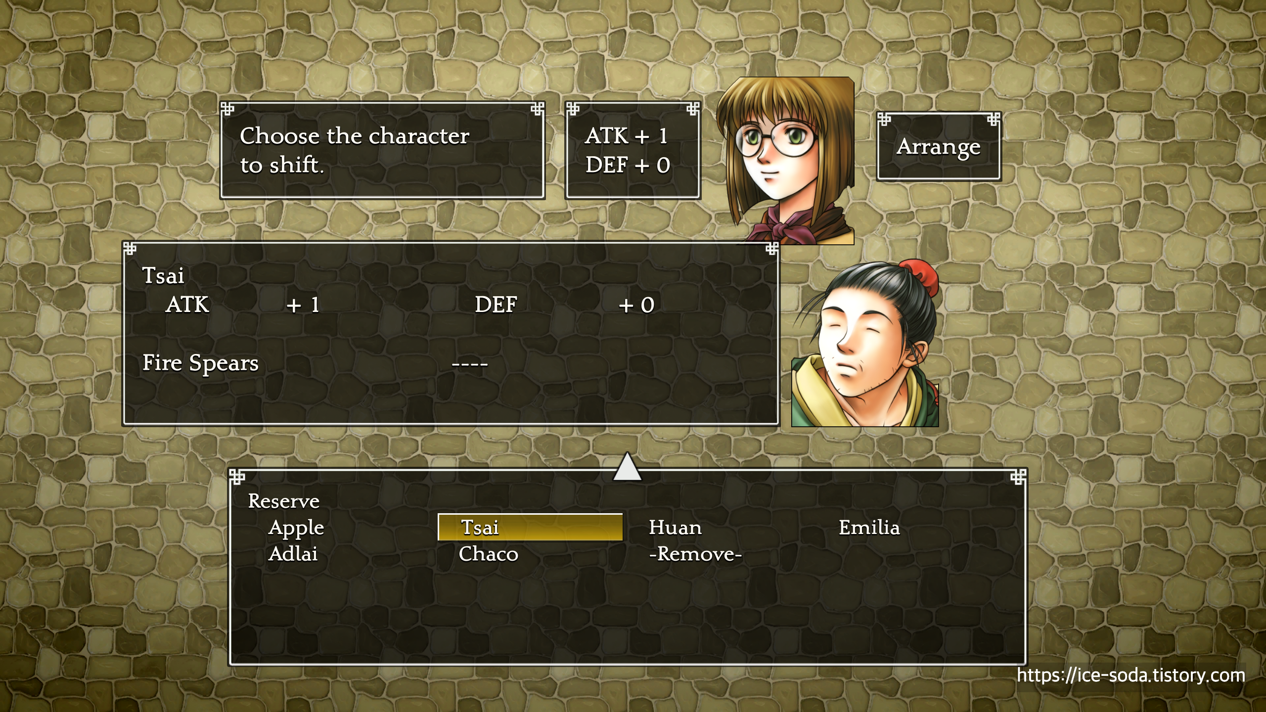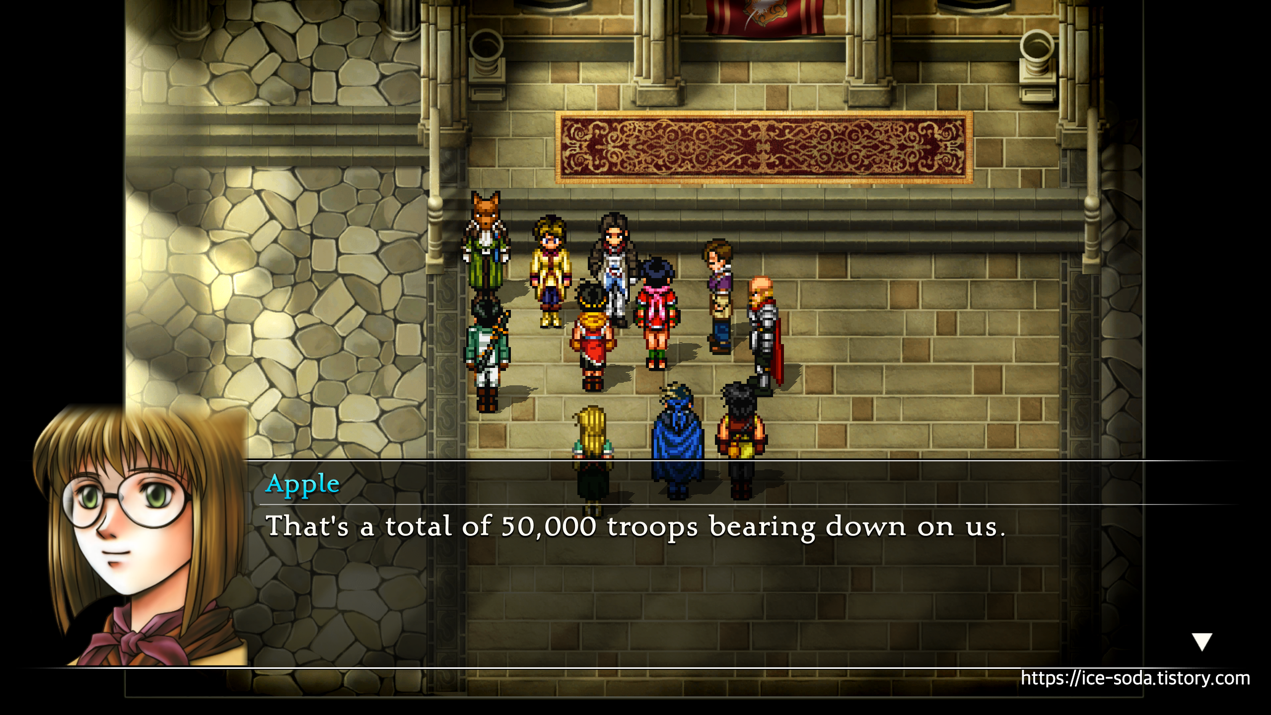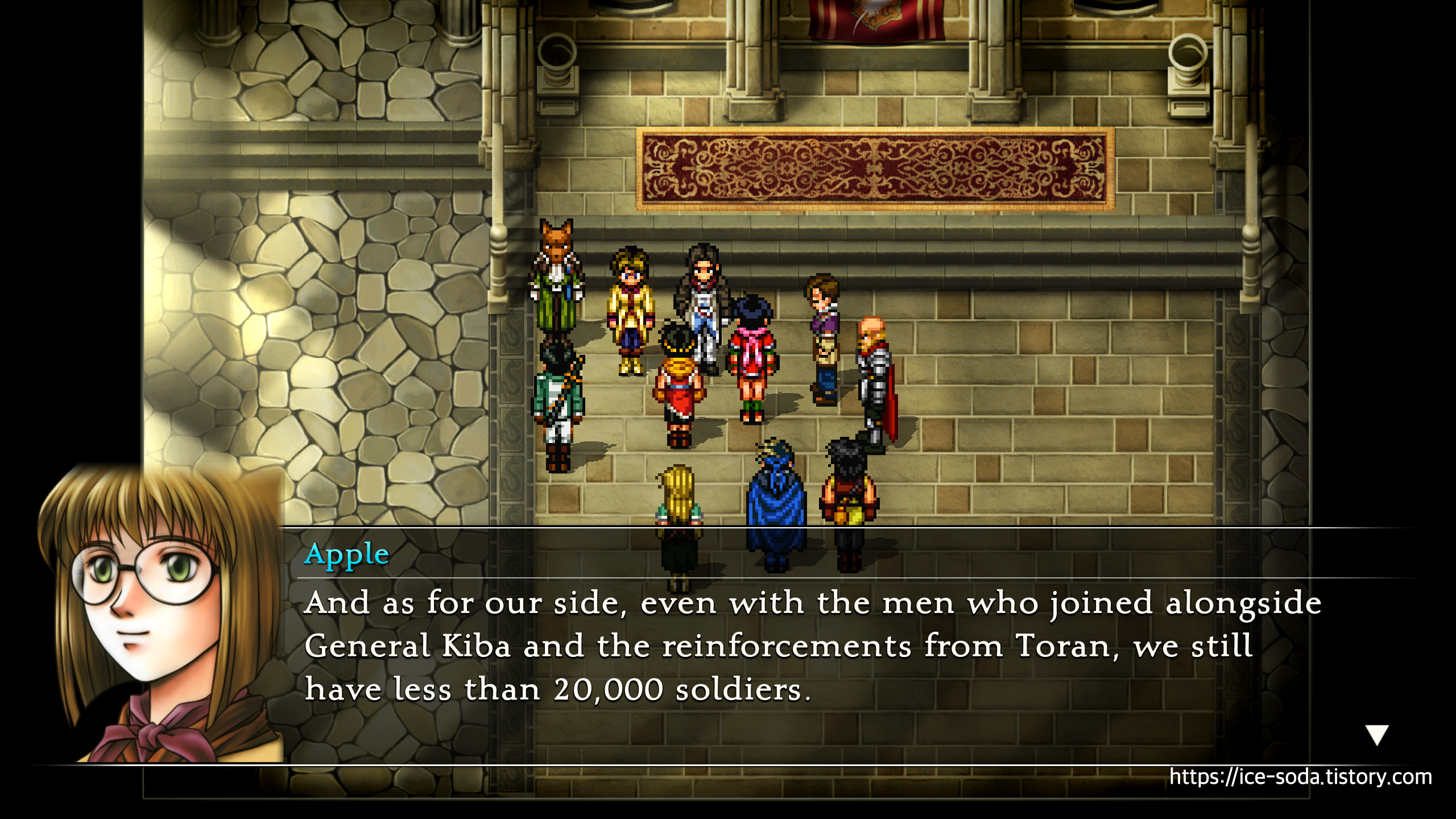 애플에게 부대 편성을 마쳤다면 밖으로 나가서 세이브 한 뒤, 다시 슈우에게 말을 걸어 이젠 진짜 출전하도록 하자