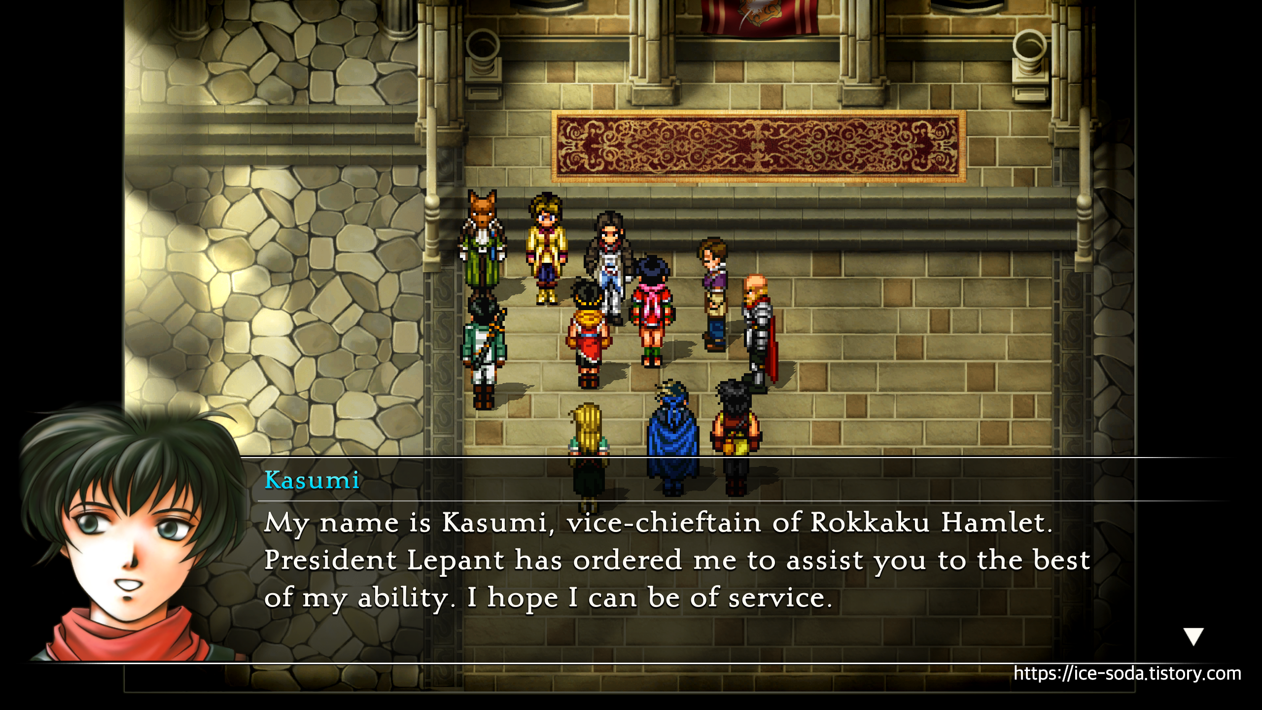 "록카쿠 마을의 부촌장, 카스미라고 합니다. 레판토 대통령님께서 제게 최선을 다해 여러분을 돕도록 하셨습니다."