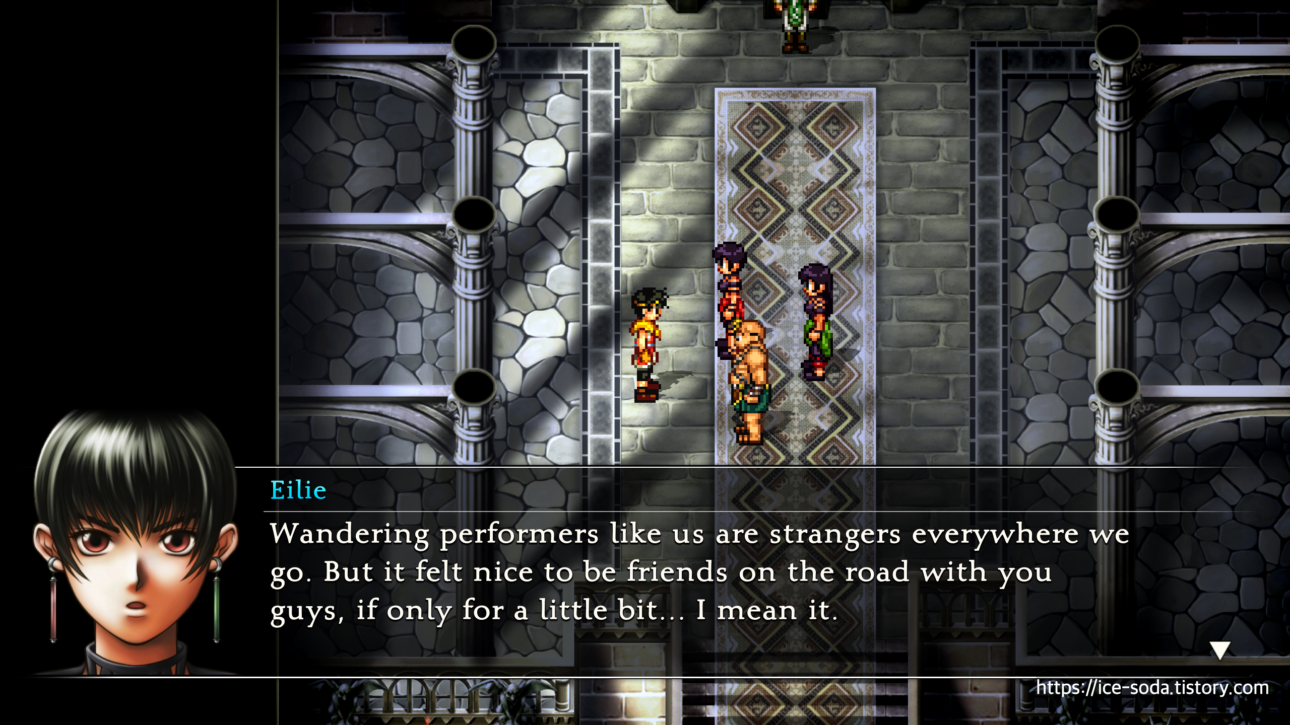 "우리 같은 떠돌이 극단은 어딜 가나 외지인 취급이거든. 비록 짧은 시간이었지만 너희와 함께 여행하며 친구가 되었던 건 즐거웠어... 진심으로."