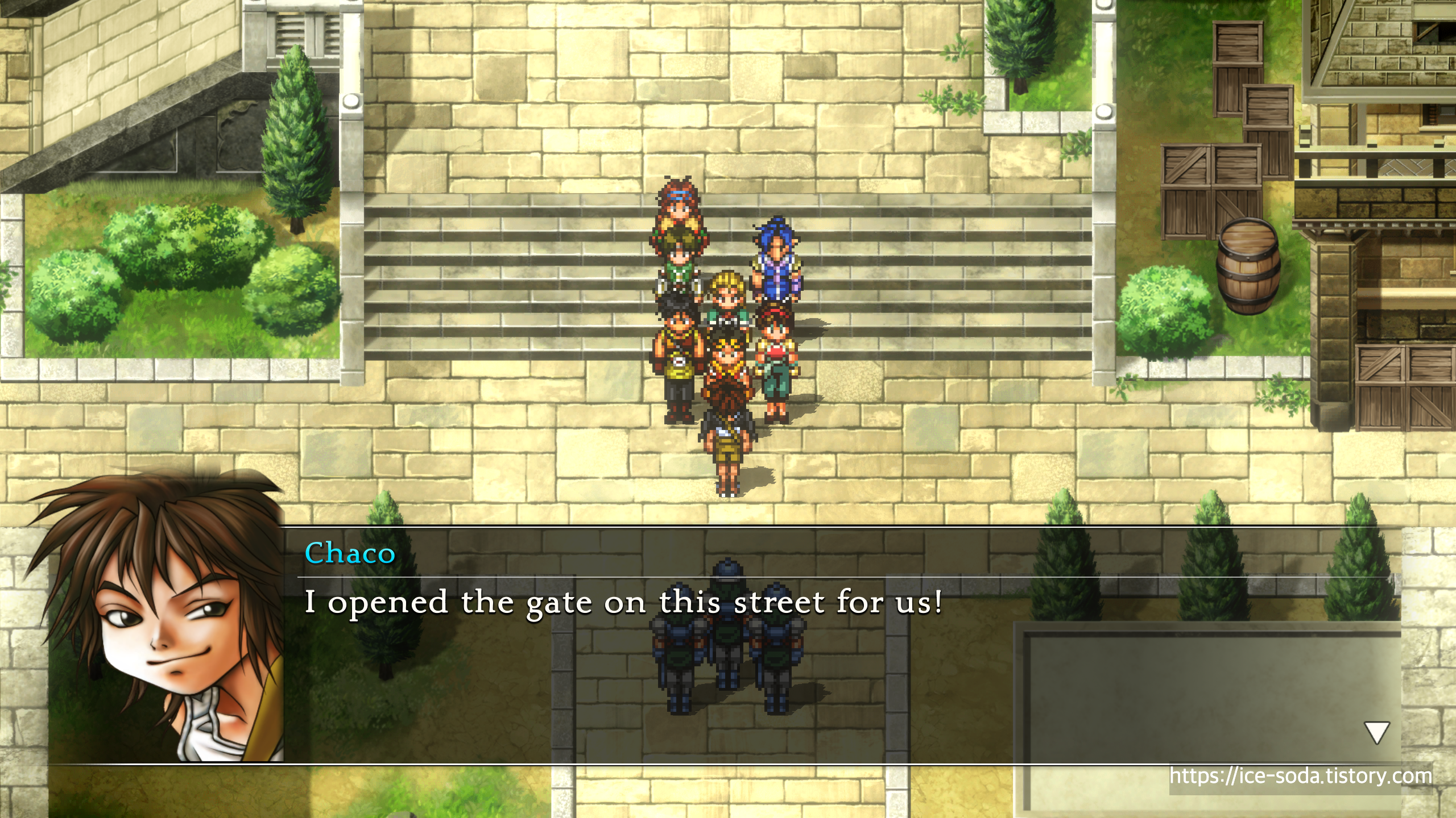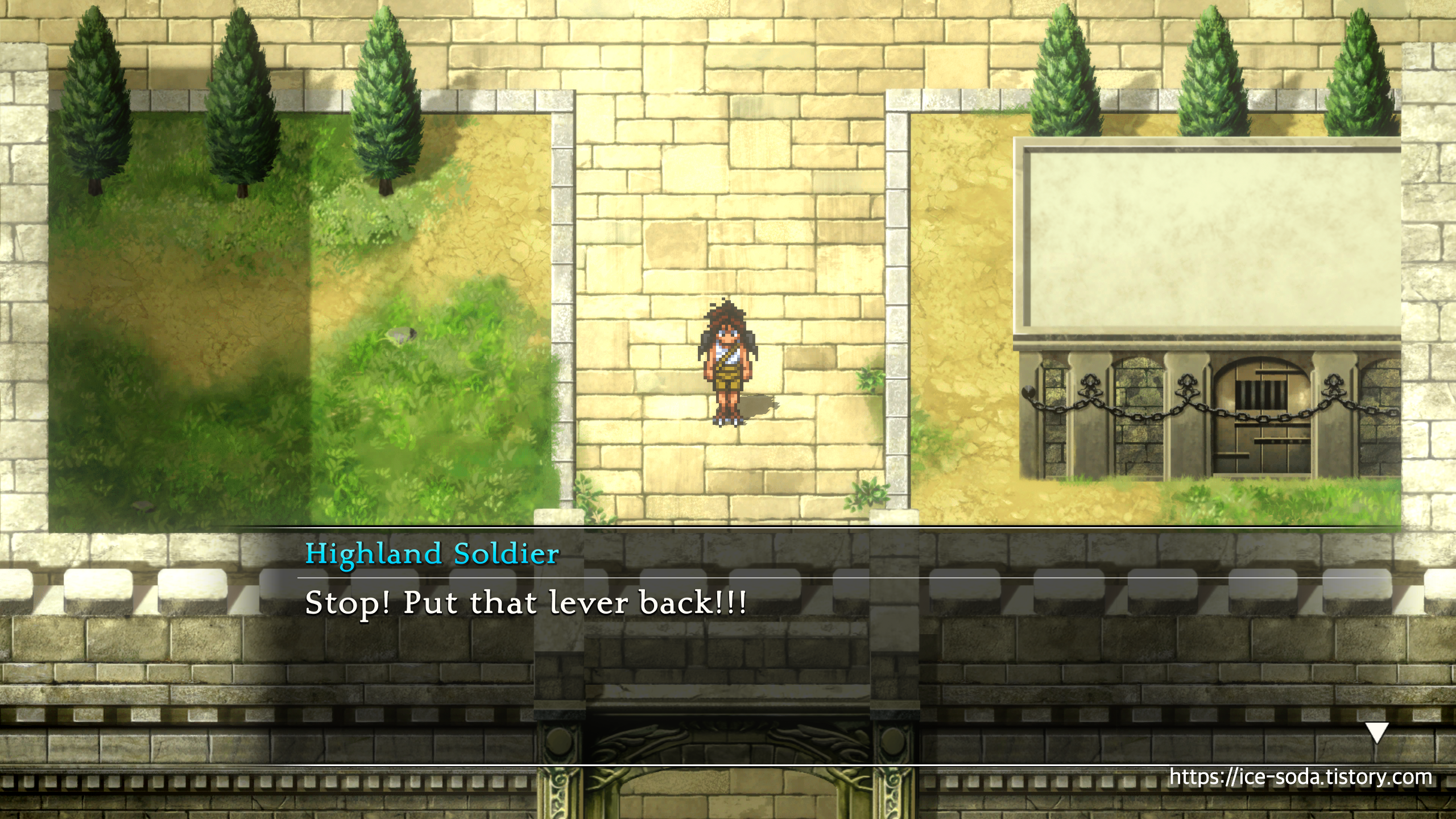 레버를 돌려달라고 챠코를 계속 쫓아가는 하이랜드 병사들.