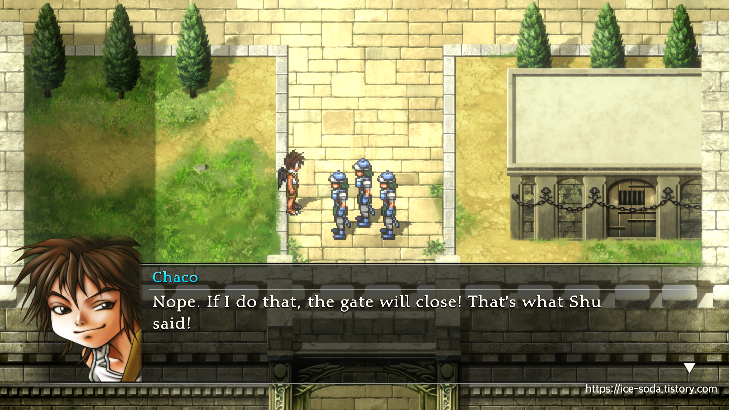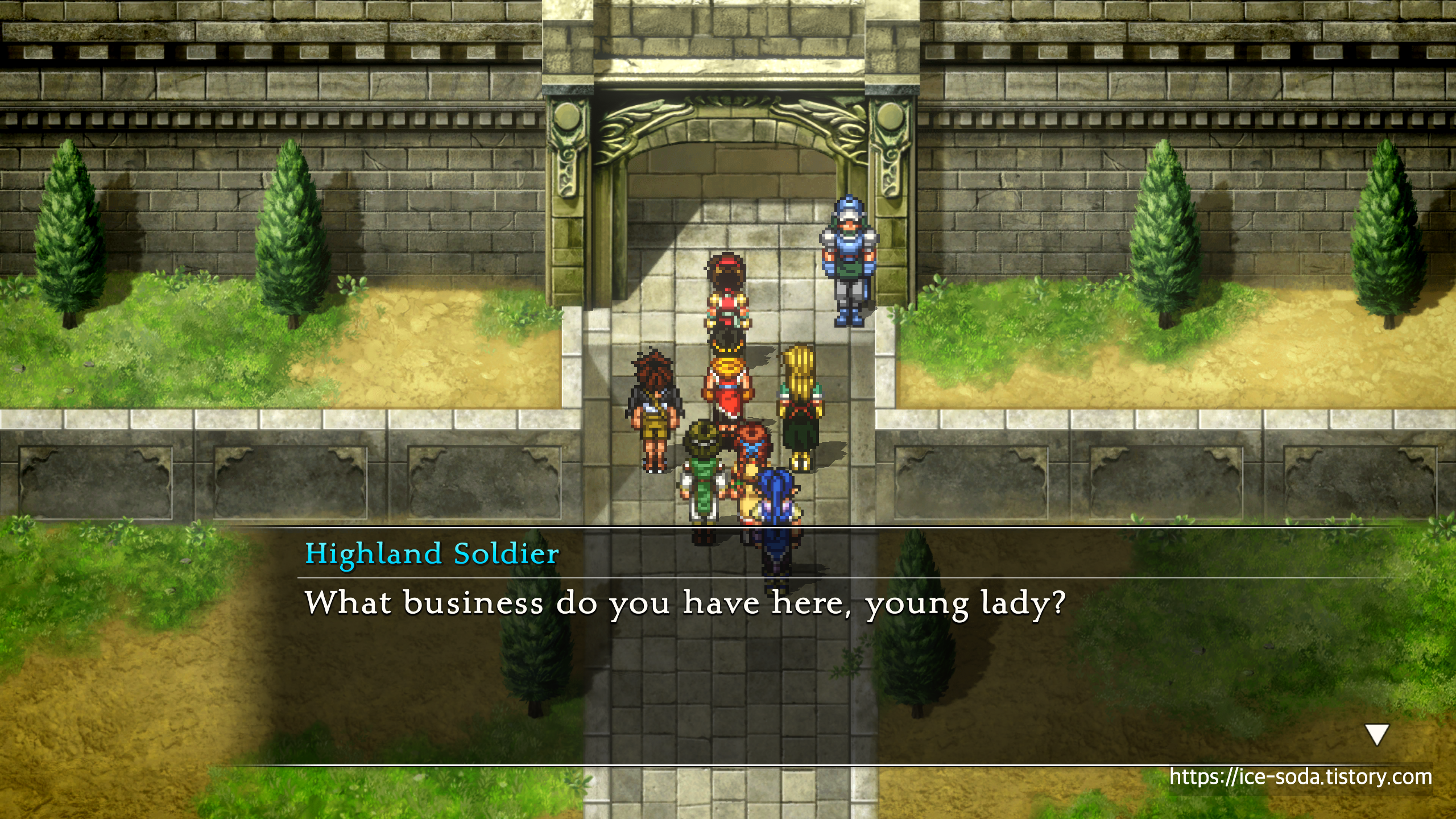 "무례를 용서하십시오. 죠우이 황제님은 죠스턴 언덕 회의장에 계십니다. 부디 지나가십시오."