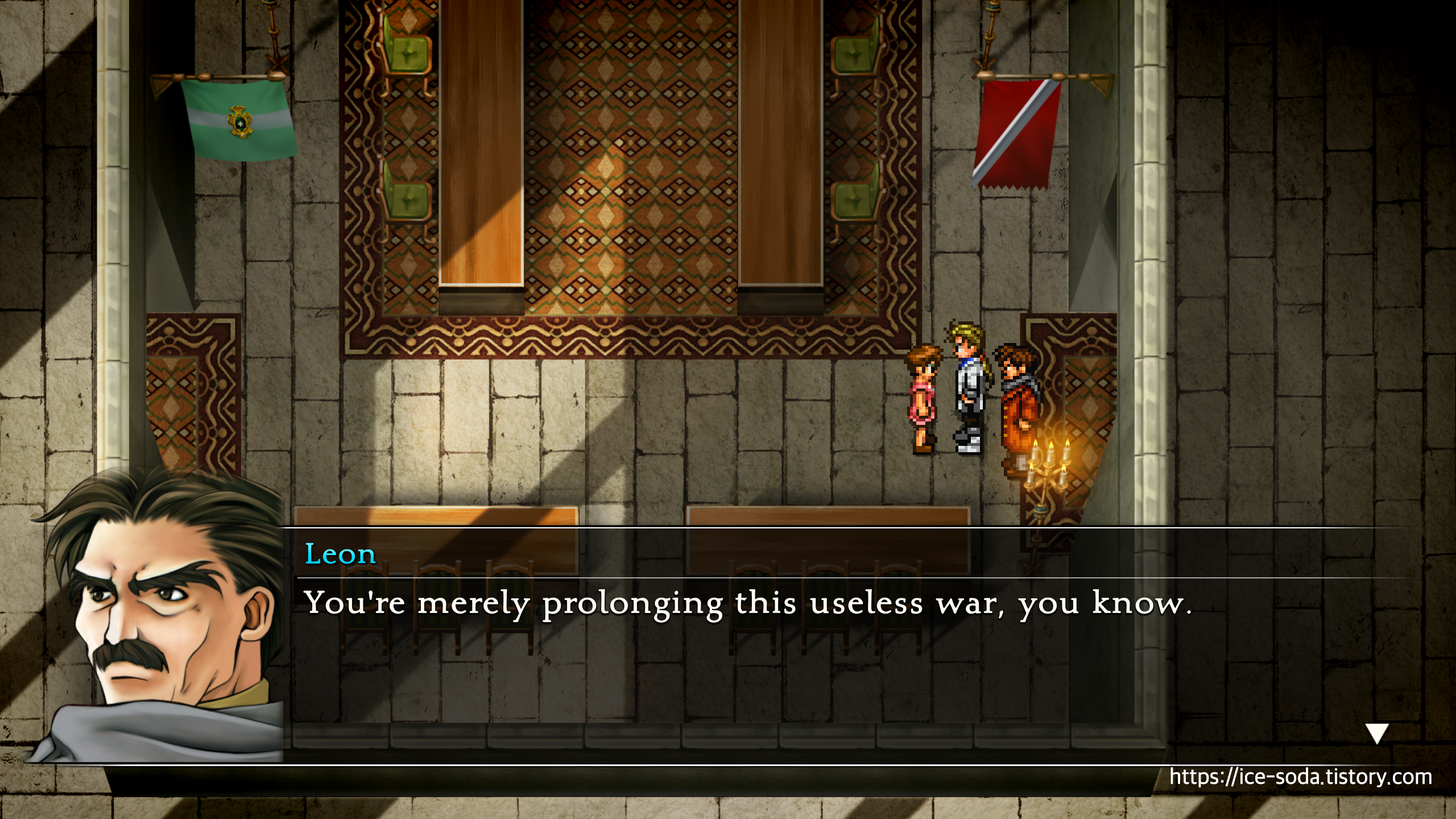 "그렇소, 이곳은 평화협정을 위한 곳이긴 하오. 하지만 이번 경우에는, 당신들이 무조건적으로 항복한다는 것을 전제하고 있지만."