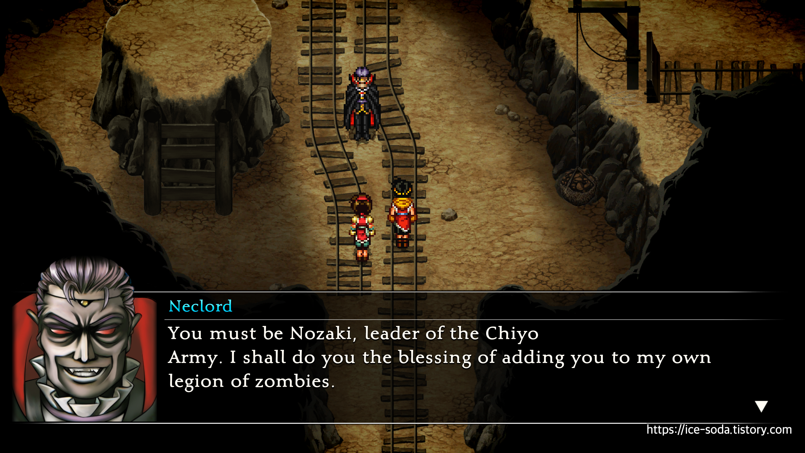 "당신은 분명 치요군의 리더, 노자키겠군요. 저의 좀비 군단의 일원이 될 수 있는 영광을 드리지요."