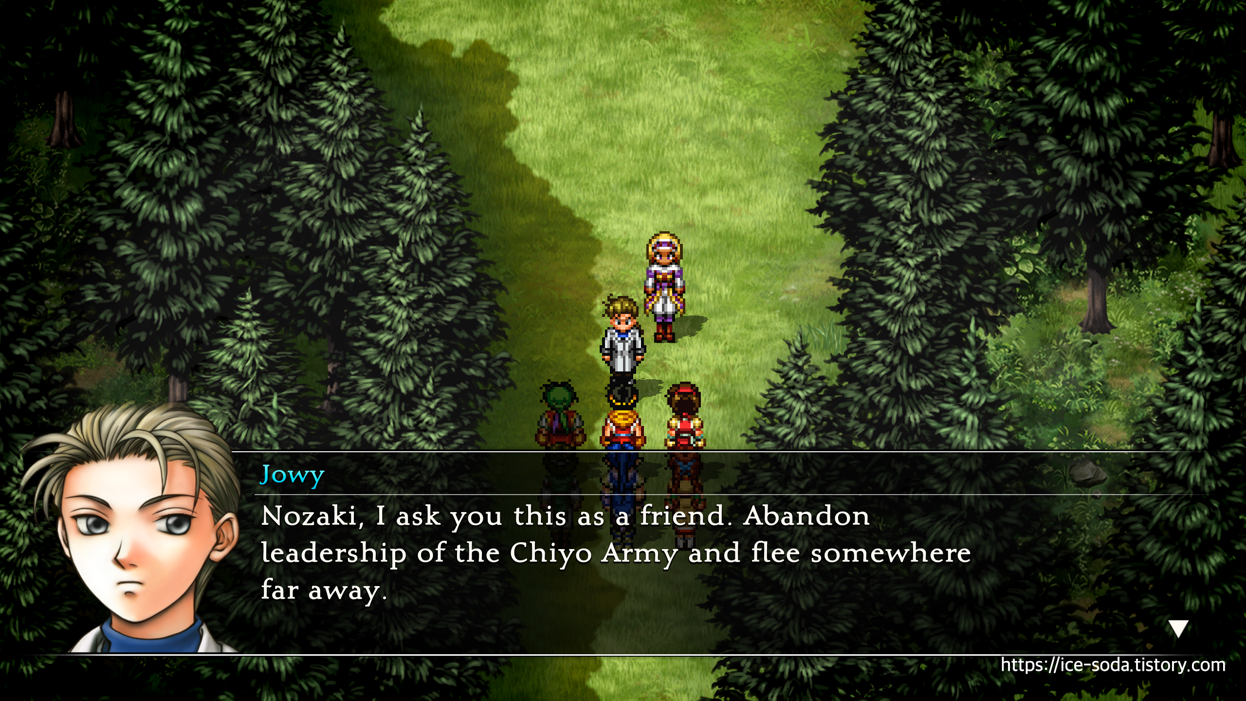 "노자키. 친구로서 부탁이 있다. 치요군의 리더를 그만두고, 어디든 도망가도록 해."