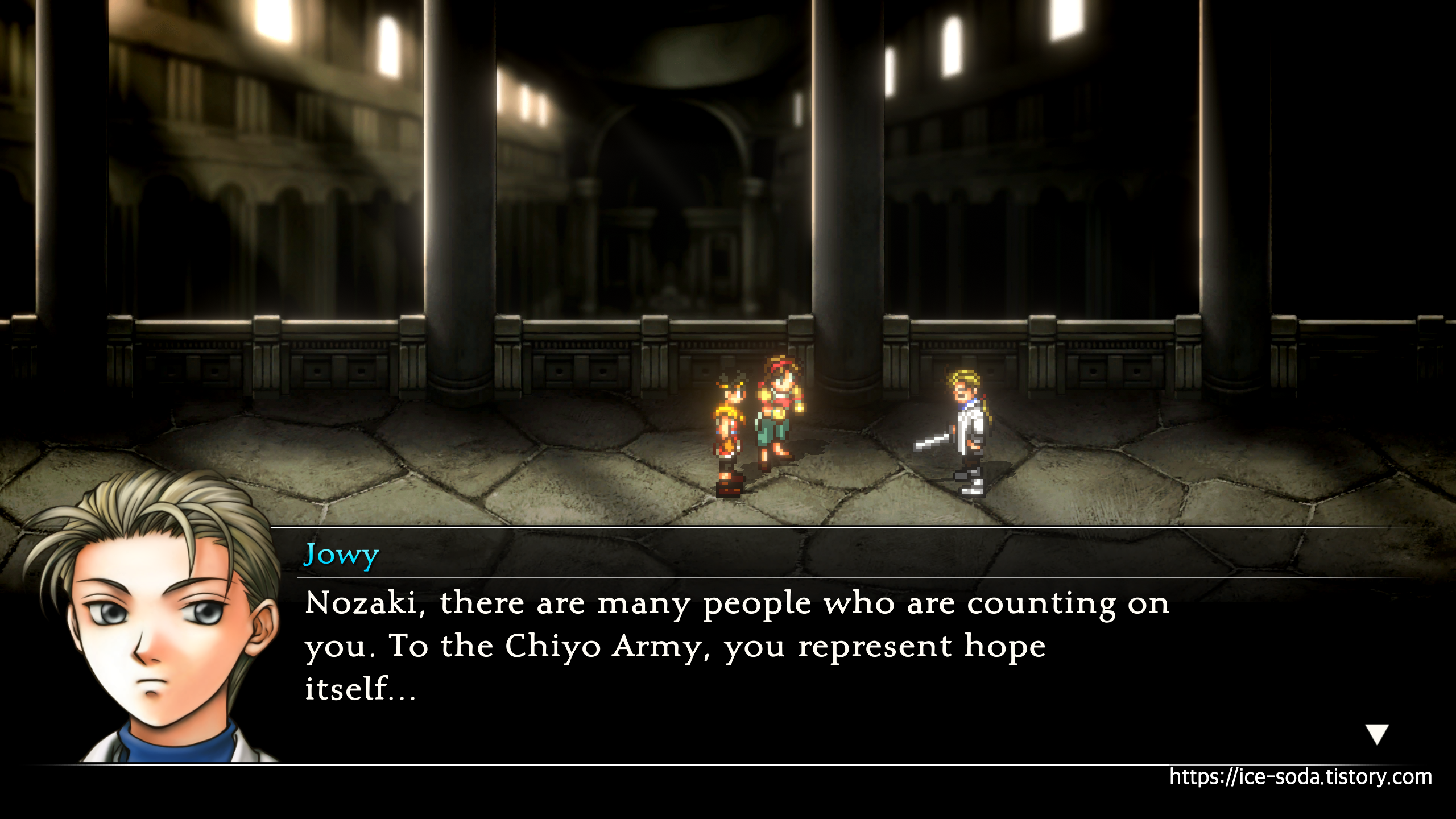 "노자키, 많은 사람들이 너를 의지하고 있겠지. 치요군에게 희망 그 자체라는 것도 알고 있다."