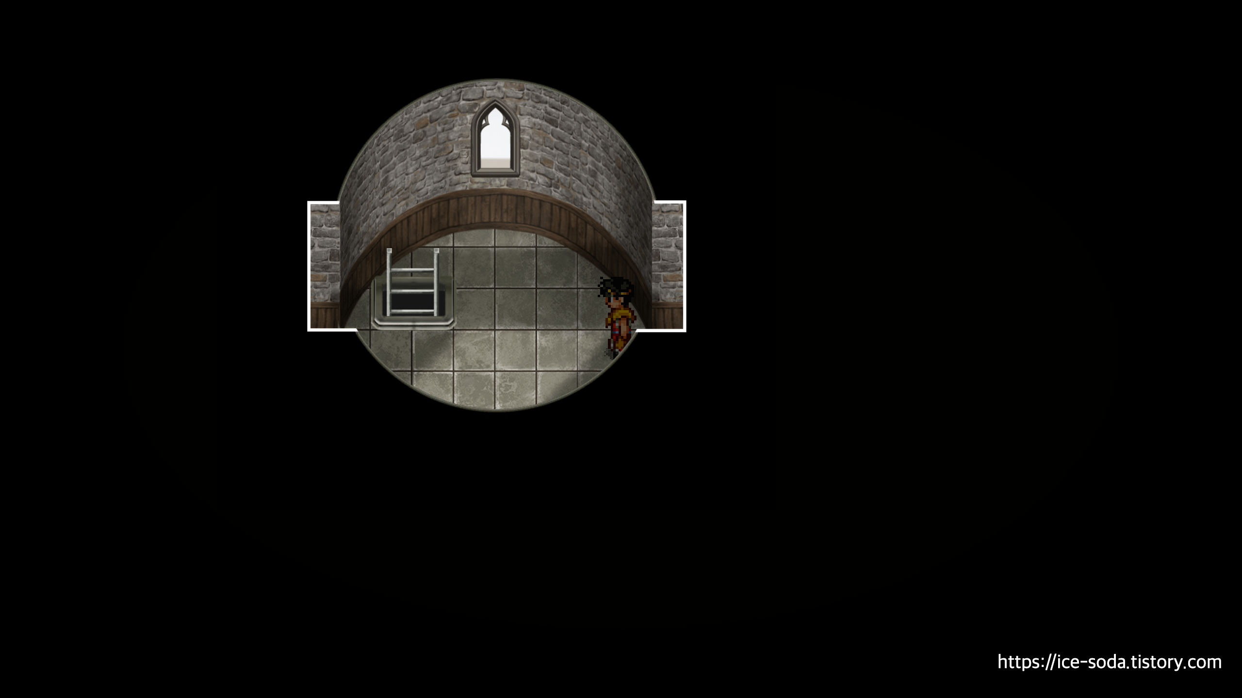 문을 열면 고통의 망토와 수의 돌이 있는 보물 상자 2개를 먹을 수 있고, 사다리로 내려가야 한다.