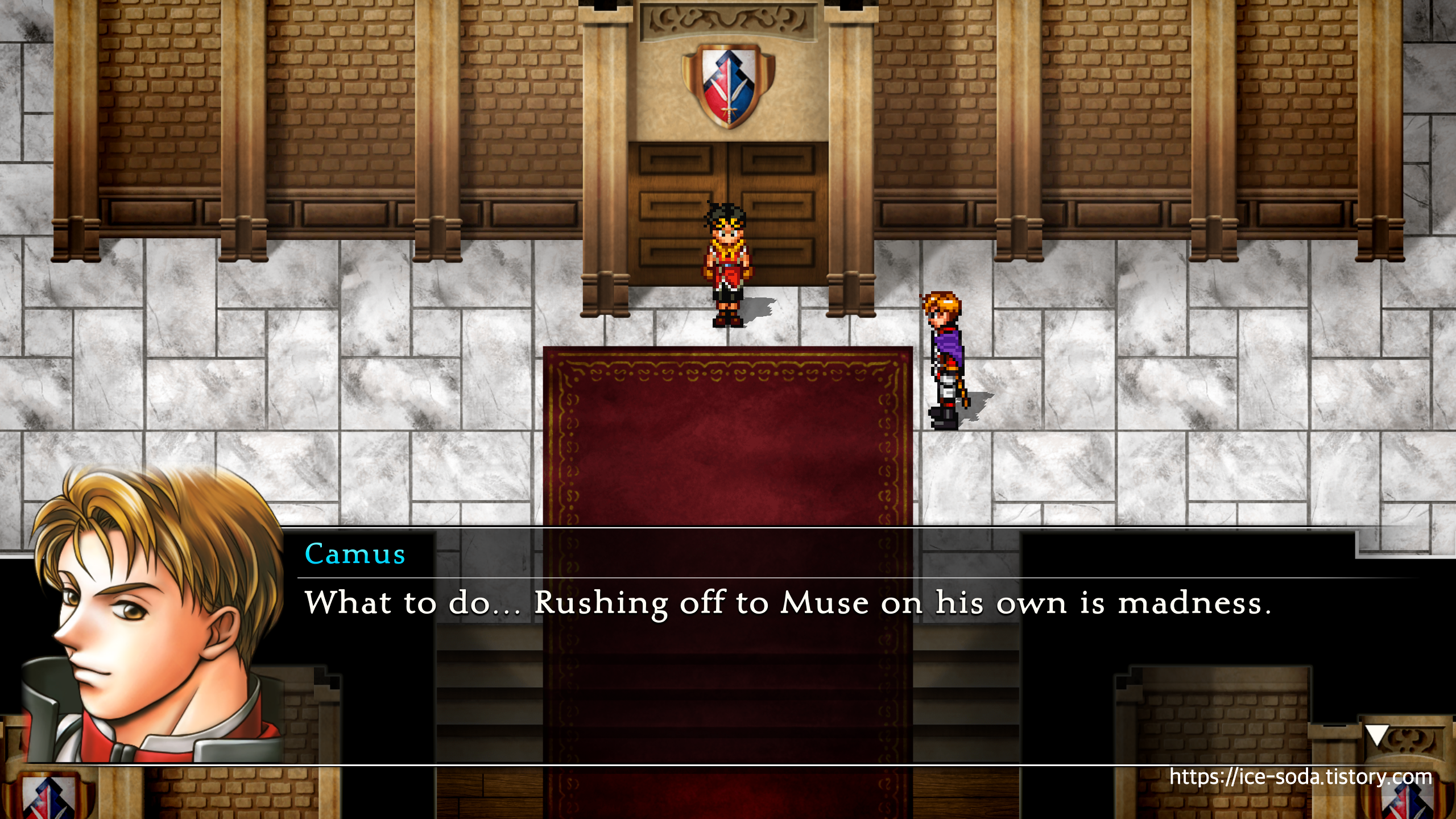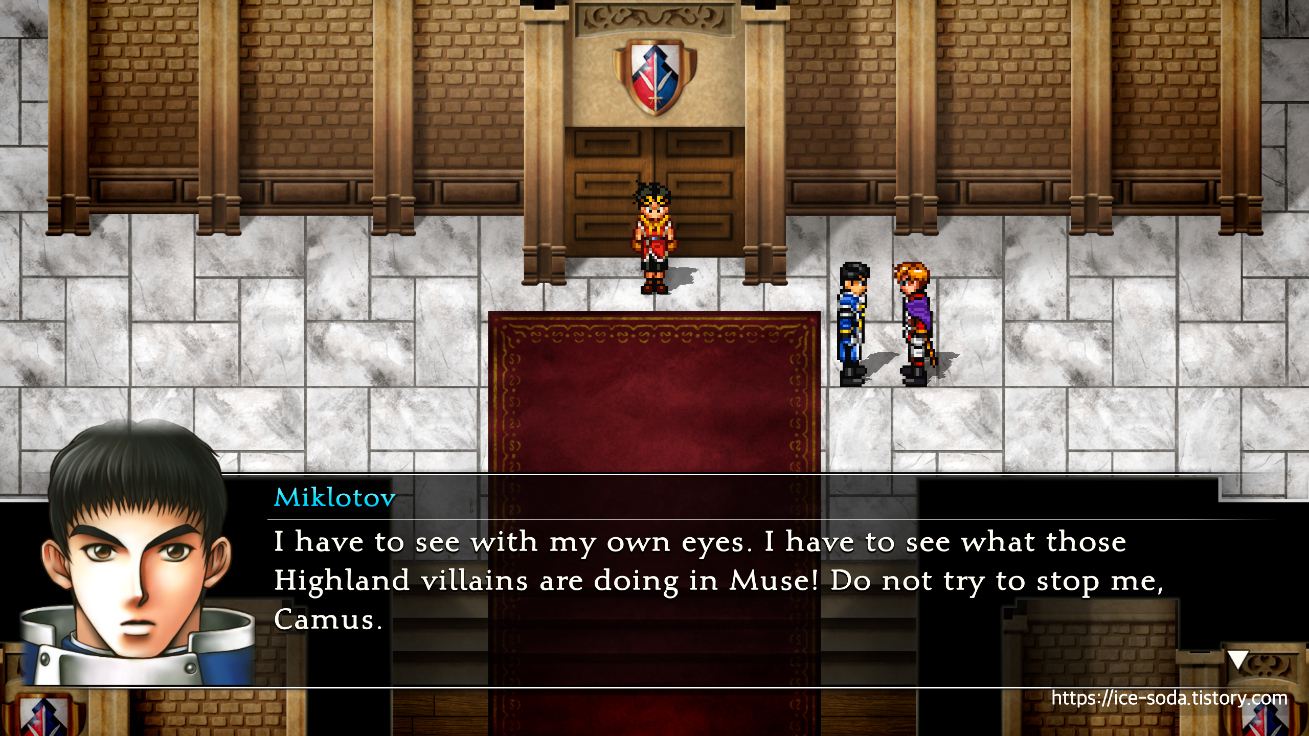 "내 눈으로 직접 확인하겠다. 하이랜드 그 악독한 놈들이 뮤즈에서 대체 뭘 하고 있는 건지 직접 봐야겠다고. 말리지 마, 카뮤."